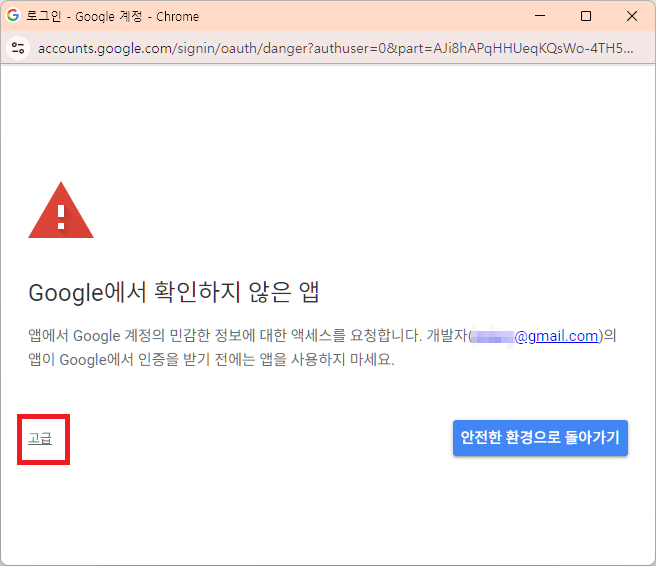 계정을 선택하면 'Google에서 확인하지 않은 앱'이라는 경고창이 나타날 수 있습니다. 당황하지 마시고 [고급] 링크를 누른 후 하단의 [이동]을 클릭하여 허용 화면으로 넘어갑니다.